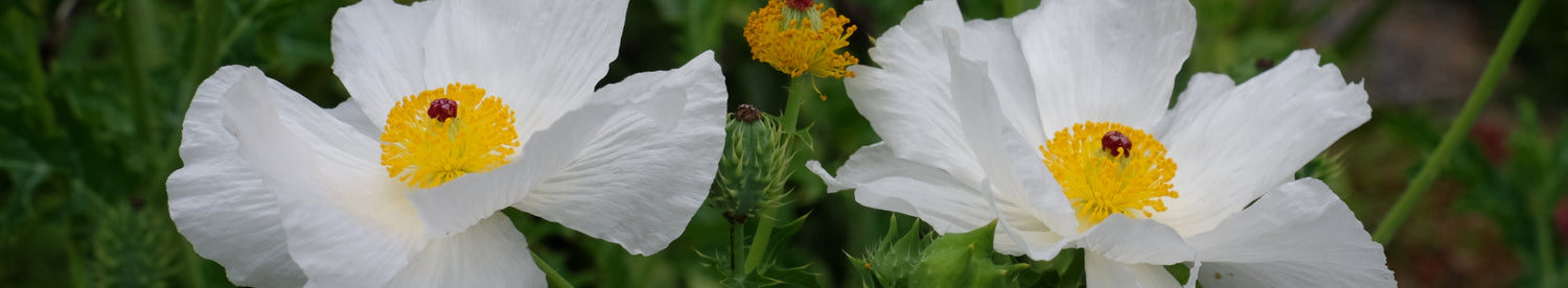 Argemone albiflora is a fascinating, deer-resistant, drought-tolerant North American native poppy, found in gravely, sandy, or disturbed areas from Virginia to Texas. Although alkaline soils are best, ours have been quite happy in slightly acidic composted loam.