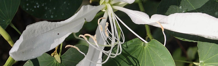 The genus Bauhinia is fairly large with over 200 generally tropic species around the world, which means they are unfamiliar to most of us in the temperate US. We have found Bauhinia yunnanensis and Bauhinia forficata to be cold hardy for us and are trialing several others to see if they might also be cold hardy. Bauhinia is in the pea family (Fabaceae) which means the plants fix nitrogen and fertilize the soil in which they grow. In the wild, bauhinia are trees or vines that can reach 35' or more, but here in our Raleigh garden they are dieback perennials that stay much shorter. In late summer, bauhinia plants flower with light pink/purple or white flowers that are more orchid-like than pea-like (they are in a sub-genus that does not produce a keel).