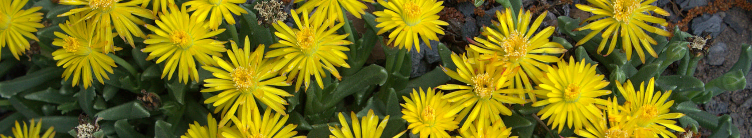 Chasmatophyllum musculinum is one of several South African succulents from the Karoo and surrounding areas, that make great rock garden specimens. Tiger jaws forms a compact mat of small, fleshy, green leaves, covered for months in both spring and fall with bright yellow daisies with orange tips on the back the back of the petals. The genus name, Chasmatophyllum translates to "crevice leaf".