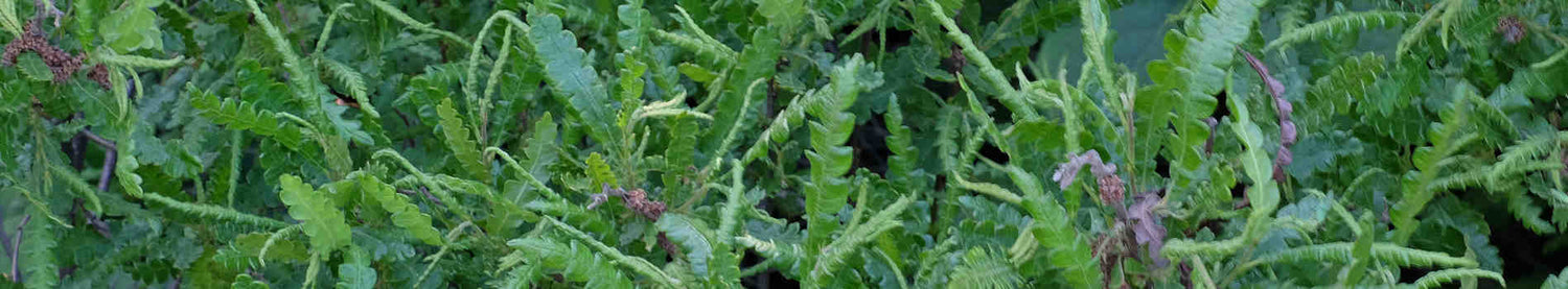 Comptonia peregrina, commonly known as sweetfern or southern sweet fern, is a deciduous shrub that is native to eastern North America. It typically grows to a height of 3-6 feet (0.9-1.8 meters) and has a spread of 4-8 feet (1.2-2.4 meters). The leaves are aromatic and fern-like in appearance, with a sweet fragrance when crushed.