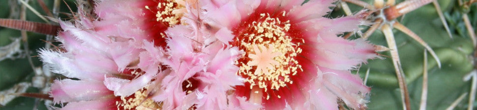 Although partially hidden in its natural habitat for most of the year, echinocactus is easy to spot when it is topped by gorgeous red-centered, light salmon to clear pink, feathery daisy-like flowers in spring. The blooms are followed by plump red fruit, attractive to hungry animals who spread echinocactus seed through their droppings, enabling the plant to populate a wide area.