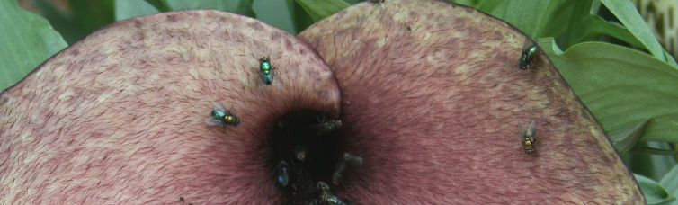 Helicodiceros flowers have the rare ability to generate heat via a process called thermogenesis...a warm-blooded plant! During the flowering cycle, the helicodiceros flower generates enough heat to volatilize the main scent components of the flower. The heat (and thus the scent) is produced in waves that last several minutes apiece. Flies, attracted by the smell, enter the Helicodiceros flower through a constricted entrance looking for a meal and are trapped inside for an entire day where they are thoroughly covered with pollen. After a day the constriction relaxes and the flies can escape, now covered in pollen.