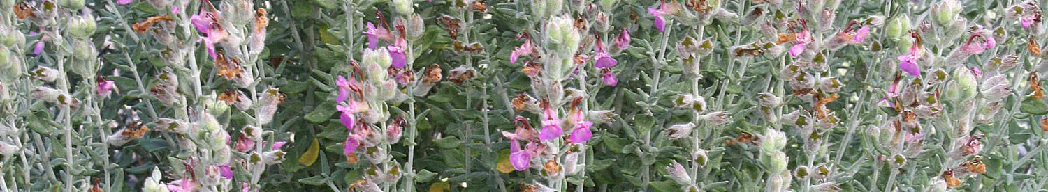 Species in the genus Teucrium are well adapted to hot summer climates and tolerate poor soils. Many species have fragrant leaves whose odor is apparent when the leaves are bruised. The leaves of some species act like catnip and make felines dizzy with delight. The leaves are also quite bitter tasting which makes it a great plant in gardens where deer and rabbits graze. Bees, butterflies, and hummingbirds like to visit the light purple/blue flowers.