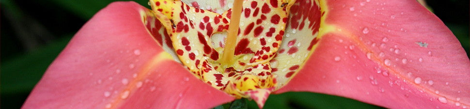The genus Tigridia contains around 30-35 species of bulbous perennials native mostly to Mexico and Guatemala. The name tigridia refers to the tiger-like coloration and spotting of the flowers, but they might more accurately be called jaguardia because of their jaguar-like spots and because the Aztecs called them "Jaguar flower". They are in the Iris family and have the familiar 3-sepal, 3-petal arrangement.