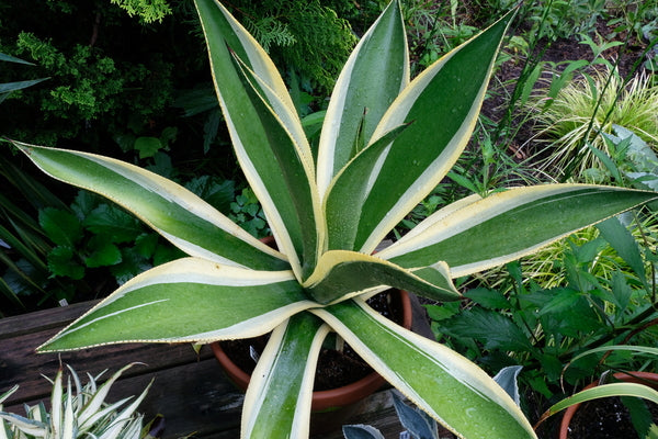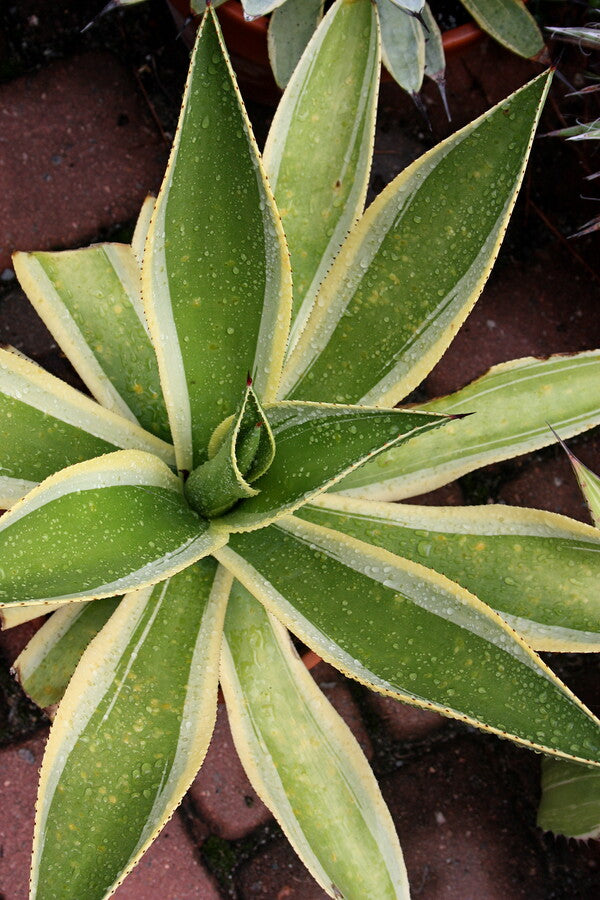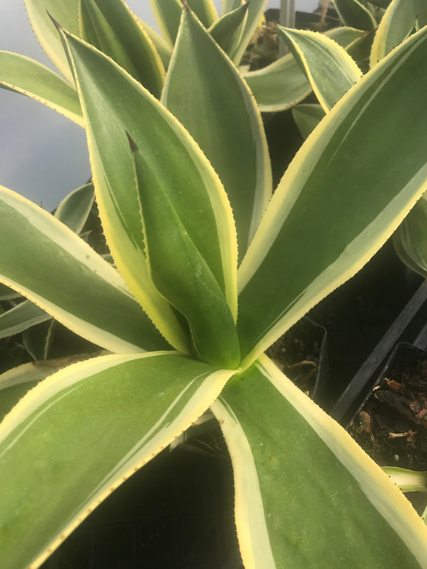 (syn: A. cundinamarcensis 'Marginata') Agave cundinamarcensis is a rarely grown century plant, due in part to its native range, in the Colombian Province of Cundinamarca, being so distant from the ranges of the more well-known agave species. A wide cream-margined form of Agave cundinamarcensis has been shared by a few European collectors, but never properly named. So we've christened it Agave cundinamarcensis 'Condor', after the Colombian national bird, which also has a lovely white ring. The non-offsetting Agave 'Condor' grows quite large like its namesake, forming a 6' tall x 12' wide specimen, composed of smooth glossy green leaves edged with tiny hacksaw-like teeth and bordered with a wide two-tone edge of pale minty-green, outlined in creamy-yellow. Agave 'Condor' is truly impressive when grown in large containers. This is a limited opportunity to add this very rare specimen to your century plant collection.
