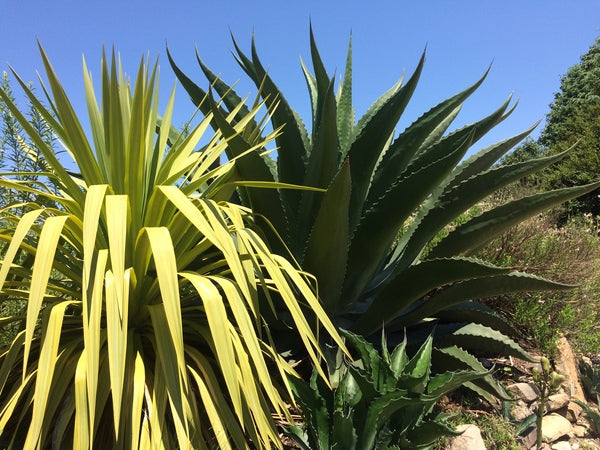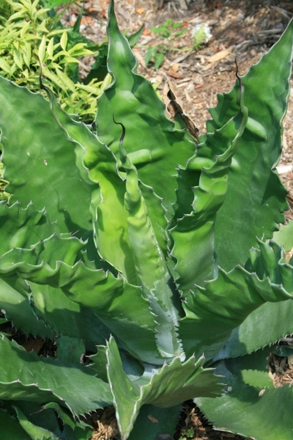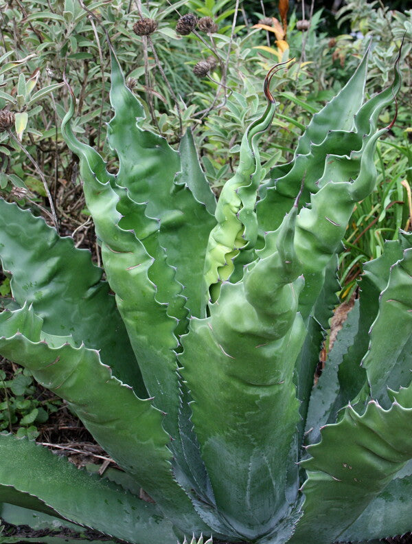 Agave 'Bellville' is a fascinating hybrid of what we think is Agave americana x Agave asperrima x Agave gentryi. We've given this hybrid the name Agave x pseudoferox, which applies to all similar hybrids that circulate in the trade as Agave salmiana var. ferox (despite flowering plants not keying out to this species). Agave 'Bellville', which grows around Bellville, Texas, (near Austin) was shared with us by our friends at Yucca Do Nursery. The glossy, dark green leaves form a massive 4' tall x 8' wide clump. Each glossy green leaf, which features deeply indented teeth, is also bizarrely crinkled as it emerges, like a shirt that didn't get ironed well. When plants are young, even the spines are wrinkled....fascinatingly bizarre. We've had this in the ground since 2004 and have never seen any winter damage.