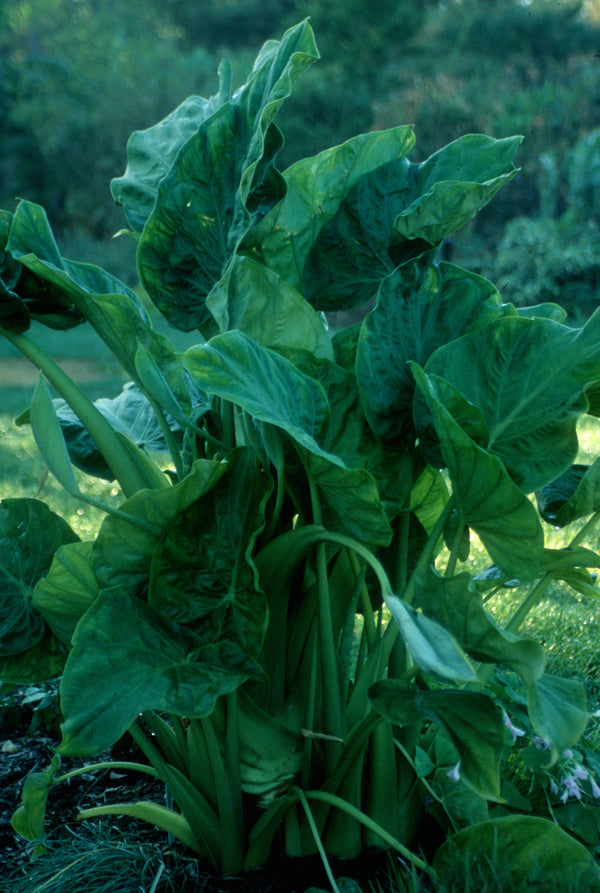 Alocasia cucullata is a husky, but compact elephant ear with thick, shiny, green, heart-shaped leaves, each with curlicue, twisted tips and upturned leaf margins. Alocasia cucullata forms a sturdy, 3' tall x 3' wide clump with 7" wide x 1' long leaf blades at the end of the upright green petioles. The flower spathe is hooded (i.e., cucullate) with the whole flower structure hiding below the leaf. The robust growing Alocasia cucullata is just perfect where elephant ear form and texture is needed without the large size.