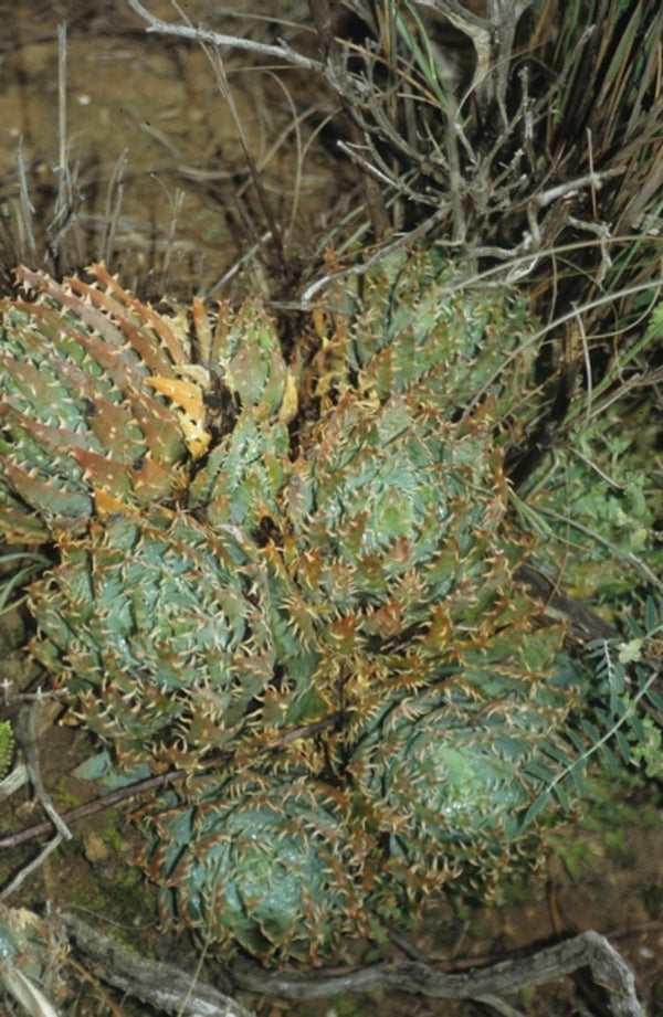 We are pleased to offer another of the winter hardy aloes we saw in the wild near Napier, South Africa in 2005. The species has a wide range from near sea level to 5300' elevation. The small tight rosettes are composed of narrow blue-green leaves covered in small raised bumps. The dense offsetting clumps are topped in spring with 1' spikes of dangling bright orange tubular flowers. For us, A. humilis has survived 10 degrees F in the garden, as long as it is not subjected to winter moisture.