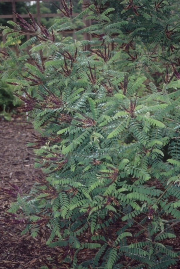 Amorpha fruticosa is one of our wonderful native leadworts, "mined" from all of the continental states except Montana and Idaho...poor guys. In the wild, Amorpha fruticosa can be found on riverbanks, although it is also remarkably drought-tolerant in a garden setting. This ornamental legume makes a multi-trunked, 8' tall, deciduous shrub adorned with pinnate green leaves. In spring it is topped, starting for us in late May, with terminal branched sprays of bottlebrush-like purple flowers, highlighted the bright orange pollen. This offering is seed grown from plants in Cochise County, Arizona.