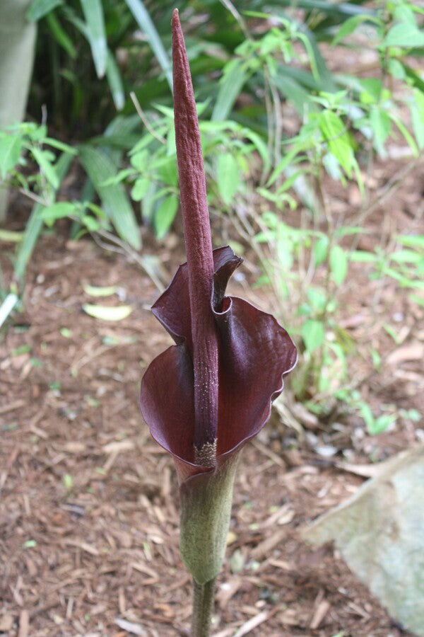 Way Cool! Amorphophallus 'Flesh Gordon' is a 2021 Plant Delights/JLBG introduction of our 1994 seedling, which boasts an exquisite light pink stem, highlighted with tiny black flecks. The growth rate and size is much smaller than typical Amorphophallus konjac, maturing at only 21" in height, but with a 30" foliar wingspan. When the corms are large enough, you'll enjoy the 3' tall purple-spathed inflorescence. We're sure that Amorphophallus 'Flesh Gordon' will get much better reviews than its cinematic pun-heavy namesake, while being equally as phallic.