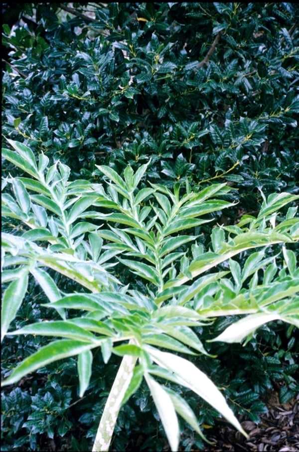 This voodoo lily has a bizarre flower, even for an amorphophallus. The speckled spathe rolls back as it opens, resembling a white banana being peeled. Inside is an amorphous-shaped, white, banana-like spadix (looking as if it were left in the microwave too long). When the flowering event is over, expect a green-and-black speckled stem to rise from the ashes, topped with a giant dissected green leaf. Each bulb will offset small bulblets for propagation purposes.