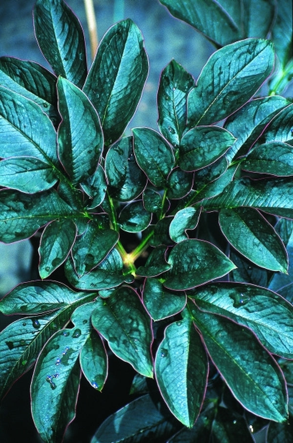 (aka: Amorphophallus saururus #1, AGA-176) This North Thailand species is grown for the stunning foliage that emerges atop an 18" tall stalk in late spring. We selected this clone for the beautiful red stem supporting the foliage. The black-green foliage emerges with a dramatic red edge that looks more like a Photoshop