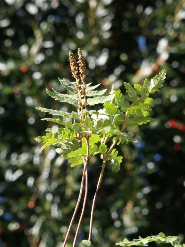 Ferns do the darndest things, and anemias are near the top of the strange fern list. This Argentine native makes a delightful small clump to 8" tall x 8" wide. In nature, we saw these growing in well-drained soils and in rock cracks at 5900' in the Salta Province of northern Argentina. The fertile and sterile fronds look similiar, except that the fertile fronds produce long alien antennae-like "flower" stalks, which are home to the developing spores. We have found this to be very growable in our raised beds.