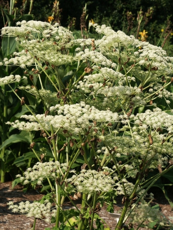 Angelica japonica is a splendid perennial, native to the sea coasts of central and southern Japan. This fascinating, summer-dormant umbellifer (member of the carrot family) has proven to be a great bold-textured garden specimen, forming an 18" tall x 3' wide basal rosette of glossy dark evergreen leaves. After a couple of years, the rosette is topped annually with a thick 5' tall spike of upright-facing large white umbels in mid-July (NC). After flowering, the clump goes dormant until late fall when it emerges and subsequently remains green through the winter. Deciduous shade to full sun are both great, but we really love the effect in winter under deciduous trees. Moist-to-average soils are fine. The foliage is foraged for food in Japan and extracts from the roots, which contain anti-proliferative furanocoumarin ethers, are used for cancer treatments.
