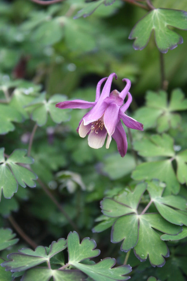 The little-known Aquilegia rockii was named after the late plant explorer, Joseph Rock, who first collected it in China where it grows from 8,000' - 11,000' elevation near the western border of Sichuan and Yunnan provinces. Our offering is from modern day plant explorers, Bleddyn and Sue Wynn-Jones, who re-collected it in Zhongdian, China (Yunnan Province, near Tibet). Aquilegia rockii makes a 2' tall plant with reddish stems that are adorned with lovely green leaves, each highlighted with a central silver pattern and a dark purple border when spring days are cool. Aquilegia rockii is topped with pendulous light lavender flowers often starting in May/June, long after most other columbines have finished blooming.