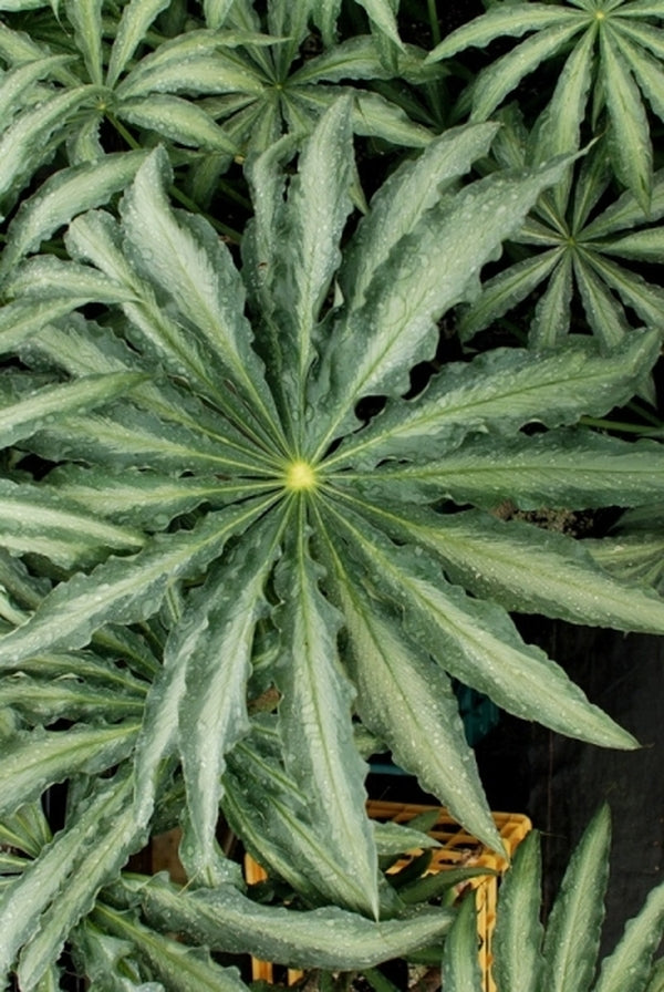 We are truly thrilled to be able to introduce the latest hybrid from Ellen Hornig of Seneca Hill Nursery, that she describes as her best arisaema introduction ever. Ellen describes it as "a real drama queen" ..."sort of Arisaema 'Perfect Wave' on steroids"... "bigger, more vigorous, better substance, and a strong rippled/crisped edge". The 30" tall thick stalk is topped with a glaucous green radial leaf with heavily rippled edges, and adorned with a wide central stripe. Arisaema consanguineum does not grow vigorously in deep shade, so a very open canopy or a few hours of morning sun is preferable. I'm not sure what else I add, other than to christen this the Lady Gaga of Jack-in-the-pulpits.
