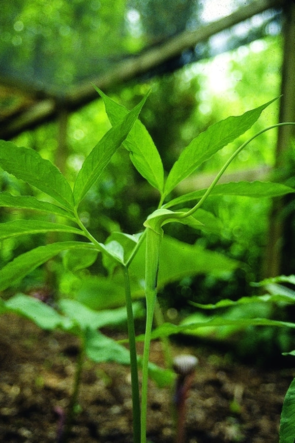 This unique form of Arisaema heterophyllum hails from China's magical Mt. Omei, where it resides under giant cryptomerias around the Baguo Temple. The 3' tall slender stalk is topped with a large horseshoe-shaped leaf composed of up to 23 leaflets. Emerging from near the base is a separate 3' tall stalk, topped at leaf level with a green helmeted pitcher with a long, erect whip-like green tongue. The Mt. Omei-native Arisaema heterophyllum 'Bagou' has one sixth the normal number of chromosomes (in case this affects your purchasing decisions) and is usually a female, compared with the more common bisexuality found in this species. If you're into long green tongues or other such deviations, we've got the plant for you. Arisaema heterophyllum is easy to grow but prefers well-drained soils.