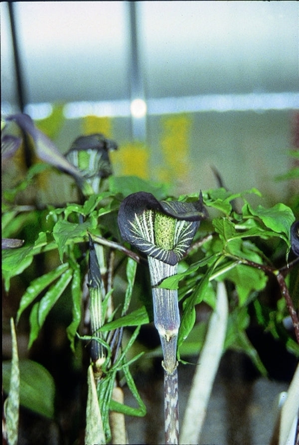 Arisaema iyoanum var. nakaianum is one of the rarest and most dramatic of the Japanese native cobra lilies...found only along riverbanks in Japan's Shikoku Province. The 3' tall single black-blotched stalk is topped with a single horseshoe-shaped green leaf with 9-11 leaflets. The jack-in-the-pulpit-like spathe is dark black with pink-to-green vertical striping. Inside the flower (spathe) sits a club-like green spadix with black freckles...each seedling is slightly different. The shape of the inflorescence is very reminiscent of the character Mushmouth on the Fat Albert cartoons.