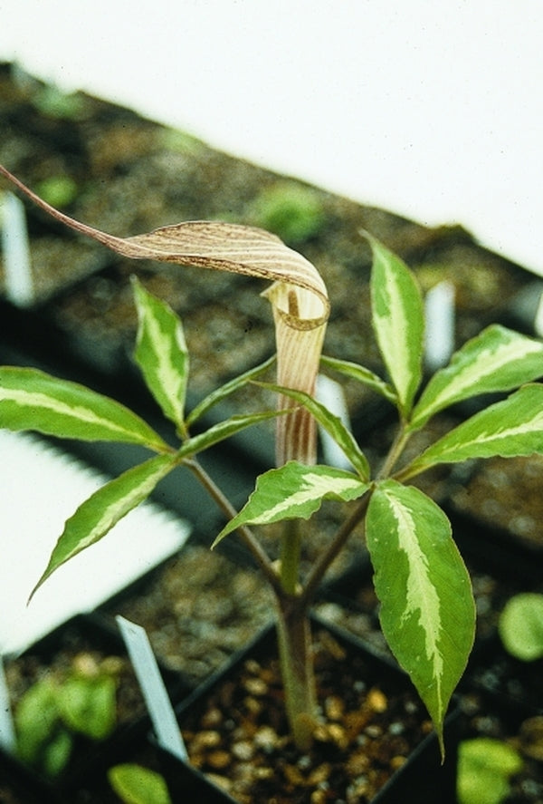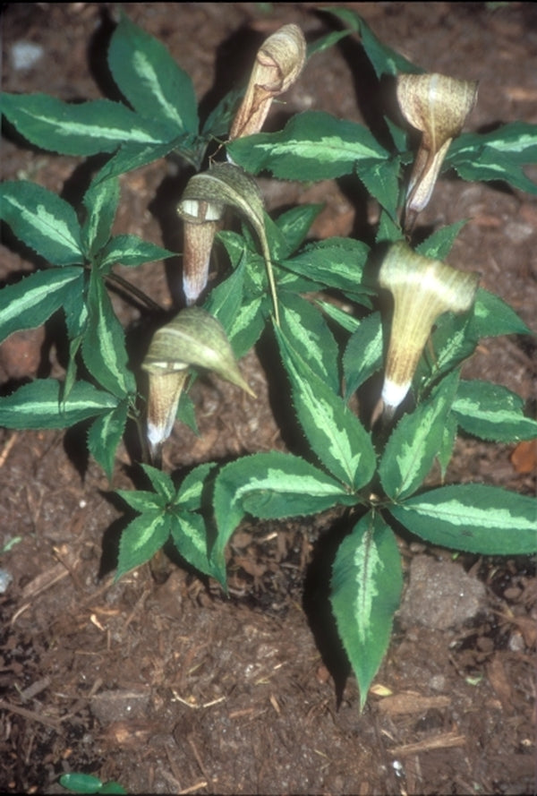 Arisaema kishidae is a little-known but easy-to-grow Japanese species (related to Arisaema serratum) that we have really enjoyed in our garden. This is a specially selected clone of Arisaema kishidae, reproduced thanks to tissue culture. Each 15" tall petiole (stalk) is adorned with two 7-9 leaflet leaves, each highlighted with a striking central band of silver. In late spring, the petiole is topped with a brownish-purple pitcher with a hood that drapes like a rigid whip over the front. The light brown pencil-like spadix barely peeks out from the center of the pitcher...probably cowering from the whip.