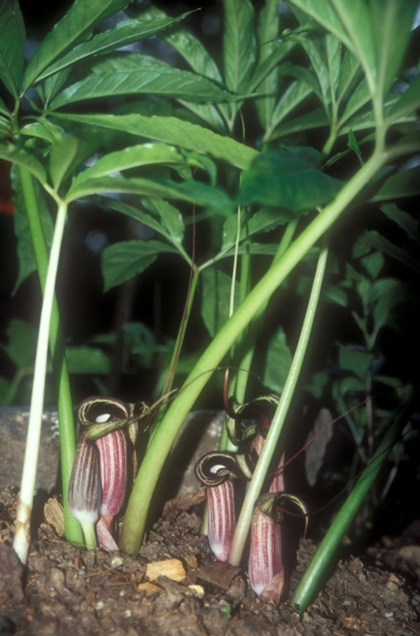 Arisaema kiushianum is one of the easiest Jack-in-the-pulpits to grow and it multiplies well so you can divide the clump after a few seasons to share with your friends. We think Arisaema kiushianum is possibly the cutest member of the genus Arisaema, boasting a solitary leaf with 7-13 leaflets that sits atop a 15" tall green petiole (stalk). The stunning 8" tall flower stalk of Arisaema kiushianum emerges from the ground beside the petiole in late April (NC). The narrow tip of the flower pitcher (spathe) folds over on itself, and the inside of the pitcher is dark purple-and-white striped with a dramatic white T-mark engraved in the back. The long, whip-like tongue (spadix) extends 6" out from the pitcher in hopes of luring insects...for sexual purposes only!