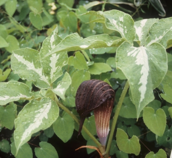 We have carefully chosen selections of Arisaema sazensoo which, in addition to the incredible flowers, have a nice silver pattern in the center of each leaf. These prized selections are perfect for adding an even more dramatic accent in the woodland garden. In spring, the bizarre Jack-in-the-pulpit-like flower emerges with the foliage...a long thread-like tail on the end of the spathe (hood) accents the purple and white pitcher.