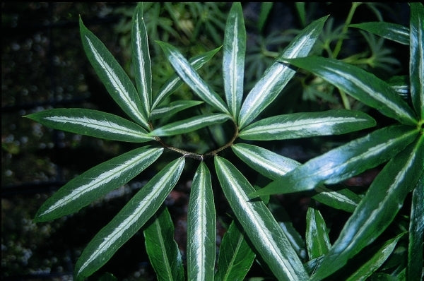 We have selected these special forms of this Japanese jack-in-the-pulpit, Arisaema thunbergii ssp. thunbergii, with dramatic silver patterns in the center of the glossy, black green foliage. The dramatic marked foliage of the silver-centered Arisaema thunbergii makes a superb foil for the equally spectacular black-striped flower that struts its stuff in spring. These are in very limited supply.