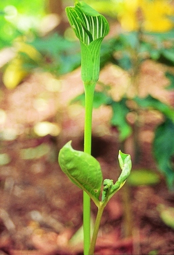 This unusual but easy to grow Chinese species of cobra lily was quite abundant in several areas that we visited during our 1996 expedition to Yunnan, China. The long narrow three-lobed leaves make A. yunnanense quite distinctive from other cobra lilies. The vivid green and white striped pitcher along with a green snake-like spadix peeking out from the opening, tops the leaf stalks in late spring.