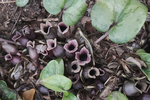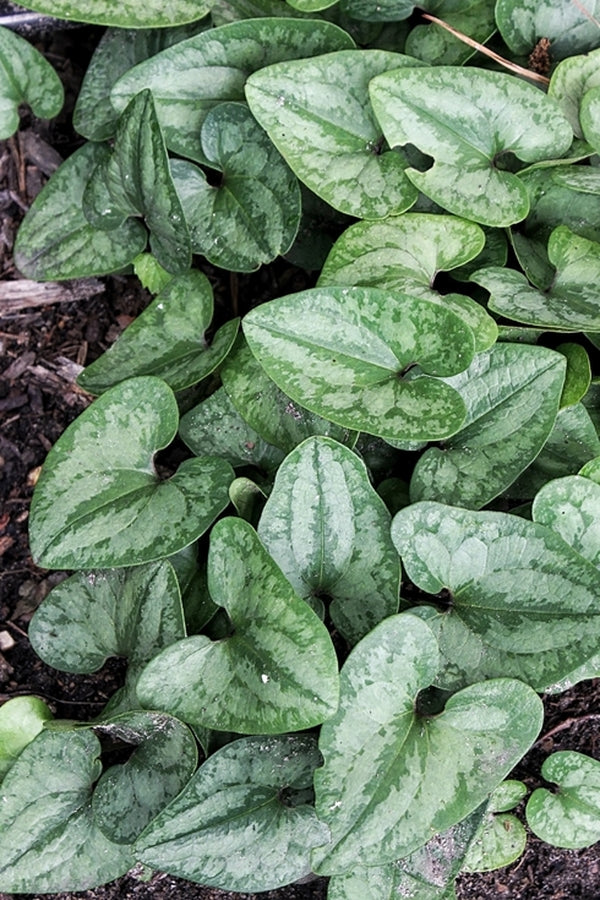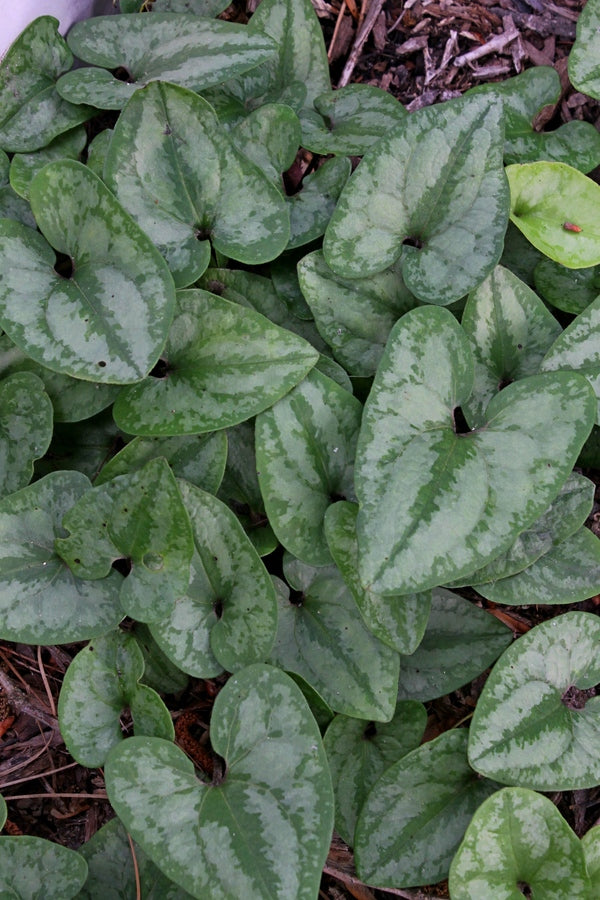 (aka: Hexastylis arifolia) Asarum arifolium 'Silver Spreader' is a 2015 Plant Delights introduction that we originally discovered in a colony of stoloniferous wild gingers in 2006 in Clay County, Georgia. Virtually every North American native Asarum arifolium forms a tight clump, but this selection makes a stoloniferous spreading groundcover reminiscent of the European Asarum europaeum. In seven years, Asarum arifolium 'Silver Spreader' has formed a 6" tall x 2' wide dense patch of anise-scented, 3.5" arrowhead-shaped, silver leaves, each highlighted by a dark green border, a central green stripe, and random green blotches. Tucked just below the evergreen foliage in late winter/early spring are cute, hairy, beige-pink, jug-like flowers. We think this will be a revolutionary wild ginger for the woodland shade garden.