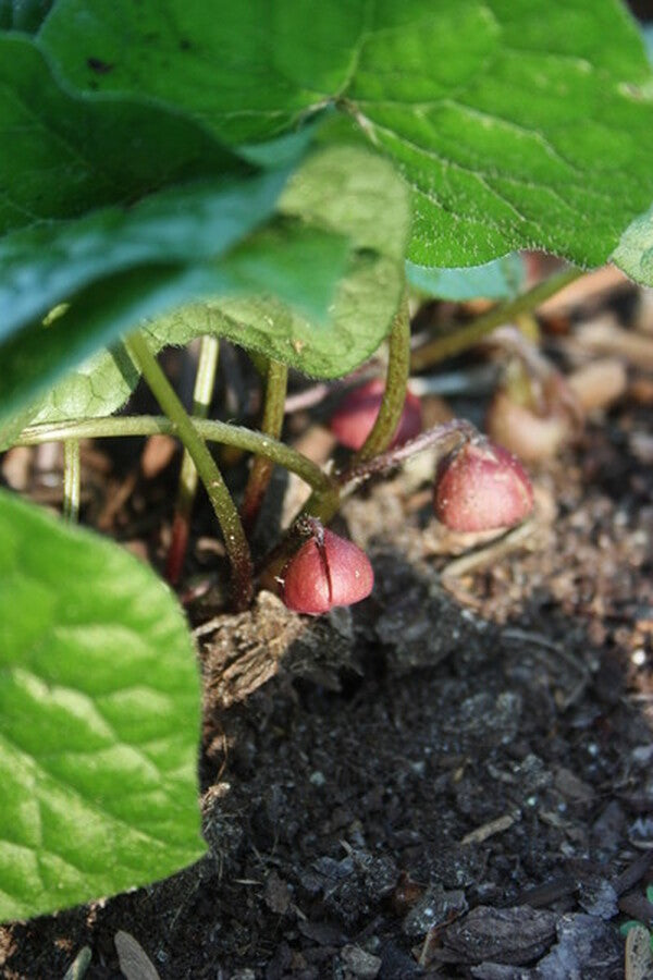 A plant that consistently gets attention in our woodland garden is the dwarf Chinese Asarum debile. We find it quite puzzling that this fabulous groundcover hasn't yet made it into mainstream commerce...something we aim to fix. Asarum debile is a streamside grower that's found in moist forests from 4,000-7,000' elevation in the Chinese provinces of Anhui, Hubei, Shaanxi, and Sichuan. We obtained this superb clone of the deciduous Asarum debile from our friend Hans Hansen in 2009, when he moved from Minnesota to Michigan. Our small start quickly developed into a 3' wide patch of small, round green leaves, held atop upright petioles. Unlike most other wild gingers, the unique small red flowers are also held on upright stalks in May and June, just below the leaves. We think Asarum debile 'Coveralls' is an absolute delight and hope you agree. In the world of Chinese medicine, Asarum debile is better known by the alias "tong qian xi xin."