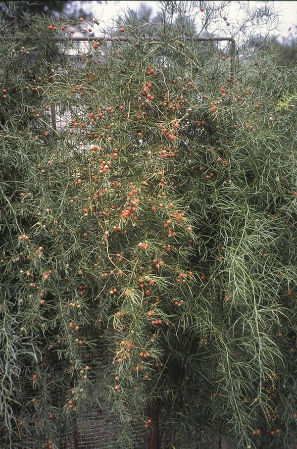 Imagine an asparagus that behaves like a twining vine to 15' tall, has glossy green foliage covered in fragrant white flowers in late spring, and is smothered with 1/2" bright red ornamental berries in late summer. Did we mention it's cold hardy to Zone 3? Would you believe it? Well, it's true, and we are pleased to be able to share one of the most unique plants we have encountered. The original seed came from the old DeGiorgio Seed Company via the late Harlan Hamernik, who also adored this perennial in his Nebraska garden. The foliage stays green into the mid-20s F, serving as a perfect foil for the red berries. Any sturdy trellis, old junked pickup, or stationary highway worker is perfect for support...stand back and watch it grow. Fruiting should take about 3 years from potted plants...very cool!