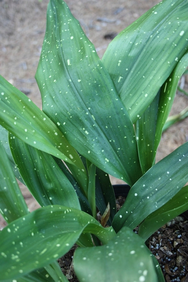 (aka: Aspidistra sp. A1TW-240a) Aspidistra 'Yushan Starbright' is our 2008 collection from 2,100' elevation in Taiwan's Hualien County. The 26" long x 3" wide dark green leaves are adorned with very large creamy spots. Aspidistra 'Yushan Starbright' was burned to the ground at 9 degrees F in 2013/2014, but resprouted nicely. Around Christmas time, the half dollar-sized red and yellow pie-shaped flowers appear at ground level among the leaf stalks.