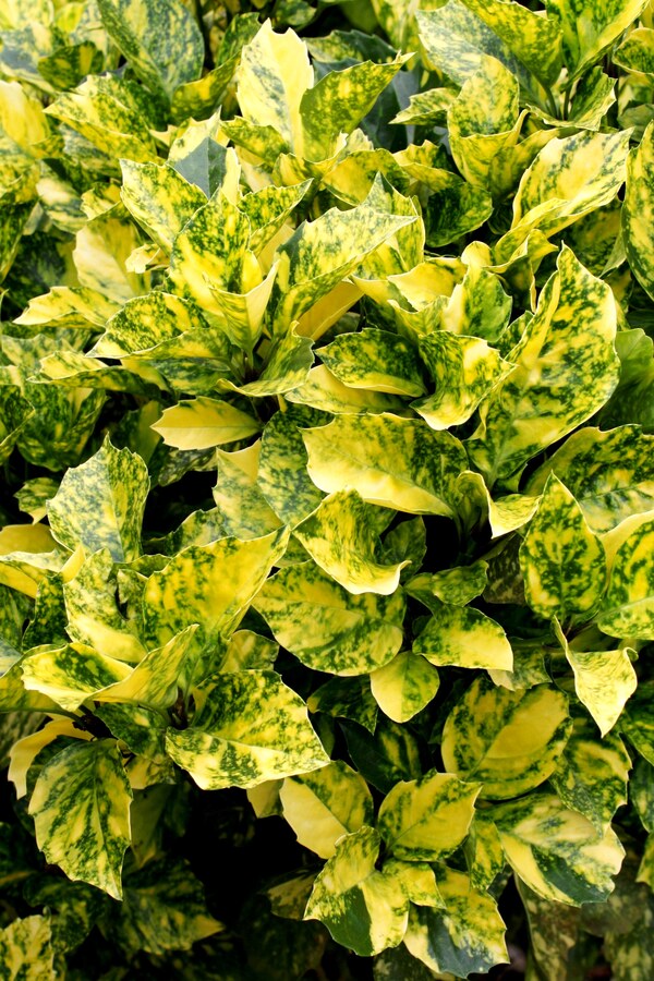 Aucuba japonica 'Suruga Benten' is an old but rarely seen Japanese selection that is one of the most stunning clones we've grown. Aucuba 'Suruga Benten' forms a 4' tall x 4' wide specimen, clothed with 5" long x 3" wide, very serrated leaves with irregular green blotches on a leaf background that's screaming yellow. The new foliage is almost a pure yellow-cream. Aucuba 'Suruga Benten' is a female clone.