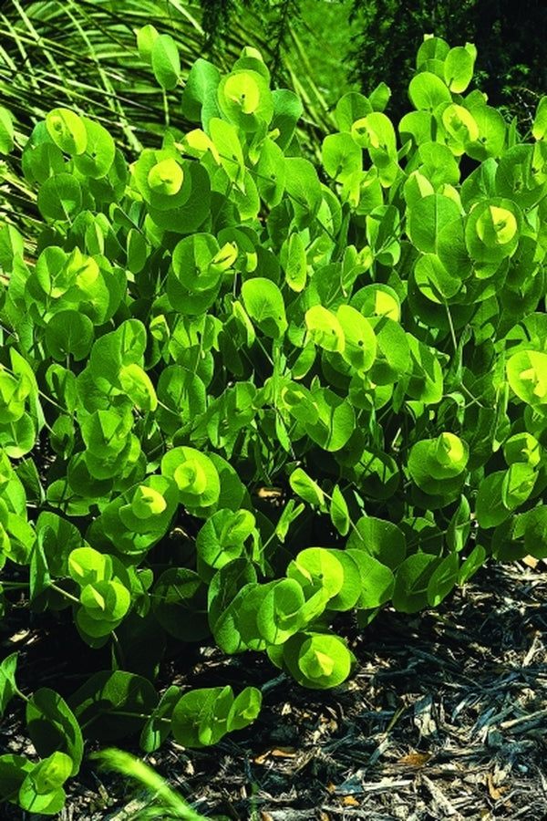 This Southeast native to dead, dry sand is another of the most unique but overlooked baptisias. The blue-grey rounded foliage looks just like a eucalyptus...even with the stem running through the middle of the leaves. In midsummer, the clumps are adorned with yellow pea-like flowers in the leaf axils. B. perfoliata turns brown in early fall but remains a sturdy structural plant in the garden into the winter...also great in flower arrangements. These plants were grown from our wild collected seed from Richmond County, GA.