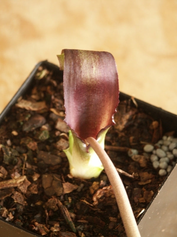 This strange little Mediterranean geophyte is right out of "Honey, I Shrunk the Arums." One of the easiest species to cultivate in the garden, Biarum tenuifolium starts growing in late summer/early fall with a bizarre 3" tall inflorescence (all the floral stuff). The inflorescence consists of a short black hood housing a extraordinarily well-endowed spadix (a "long dong"), although it smells like long dung. The 6" long, narrow, green, ruffled leaves emerge in late winter and go dormant by early summer. If you find arums too large, petunias too showy, and you enjoy the smell of rotten meat, biarums are for you!