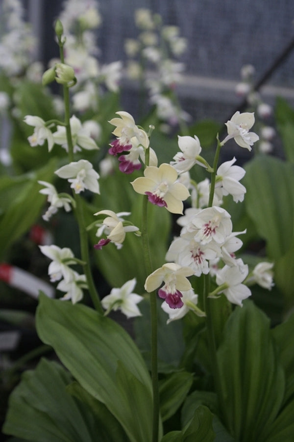 This unique Kojima strain of hardy calanthe orchids (Calanthe discolor x Calanthe sieboldii x Calanthe aristulifera x Calanthe tricarinata) produces flowers that are white to cream, rarely with a burgundy throat or lip...each seedling is different. The large, pleated, green basal leaves serve as a nice backdrop for the 10" tall flower stalks in mid-April (NC). Average to slightly moist woodland soils are best.
