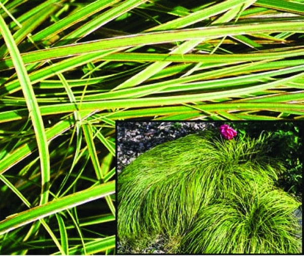 We are pleased to present this exciting new variegated form of the popular sedge, Carex 'The Beatles'. This selection by Alan Tower of Spokane, WA makes a 1' wide clump with very dark black-green foliage bordered in gold. This slow spreading sedge makes a dense groundcover that is best in moist soils. While it is native in alkaline grasslands, it seems to adapt well to slightly acidic soils as well.
