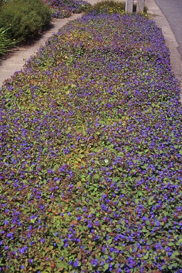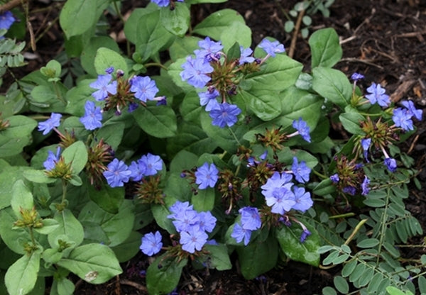 Ceratostigma plumbaginoides is an amazing, vigorous groundcover which thrives in both full sun and partial shade. The fingernail-sized, small green leaves clothe the slowly-spreading, wiry-stemmed, deer-resistant groundcover (3' wide in 5 years). From July through September, blue plumbago patches are adorned with small, cobalt blue flowers. With the arrival of cool fall weather, ceratostigma foliage takes on a lovely reddish cast. Unlike its larger cousin, Winnie, blue plumbago may be very late to emerge in spring...so be patient.