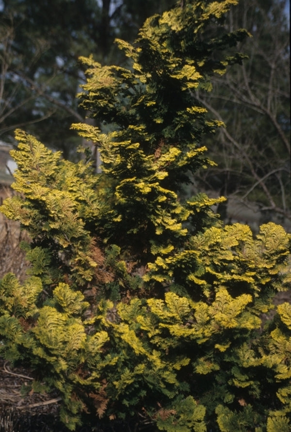 This 1984 introduction from Duncan and Davies Nursery in New Zealand is similar to Chamaecyparis obtusa 'Nana Aurea', but with a more open, informal appearance. In ten years, expect an 8' tall specimen with irregular branches of congested golden foliage. This dynamite specimen plant, eventually growing to 10' tall, holds the gold color all year.