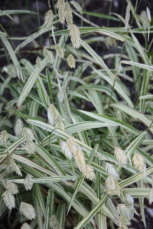 In the latest example of "Natives Gone Wild" our very own northern sea oats, which ranges from Pennsylvania west to Arizona, has been spotted sporting a new tattoo. This discovery from the folks at Itsaul Plants, forms a typical 30" tall deer-resistant clump of upright green stalks adorned by 9" long x 1" wide leaves, each heavily striped with white. As the flower stalks of Chasmanthium 'River Mist' expand in early summer, the variegation follows the new growth into the developing seed heads. Darn, this is one sexy native, so get your own variegated northern sea oats!