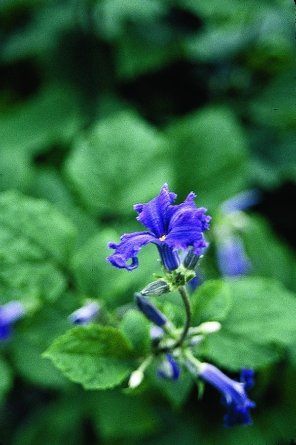 This amazing selection of the woody Clematis heracleifolia has stunning dark blue-purple flowers instead of the typical light blue flowers. The upright growth, clothed with dark green trifoliate leaves, tops out at 30" tall in early summer, about the same time that the flowers begin to appear in the terminals and leaf axils...a great border plant.
