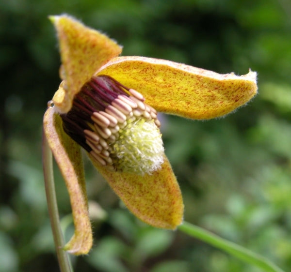 From 12,000' elevation in the popular vacation spot of Kashmir (and surrounding India and Tibet) comes a delightful but little-known clematis. Perhaps it's little known since the Tibetans burned it and then used the remains to cure indigestion and dysentery. When not on fire, the lacy glaucous-green foliage (similar to C. tangutica) adorns the 8' tall vine, laden from midsummer until fall with golden yellow bells. Each wide flaring bell with upturned tips is often highlighted by brown specks. We think you will really like growing it as an ornamental, but beware of Tibetans bearing matches.
