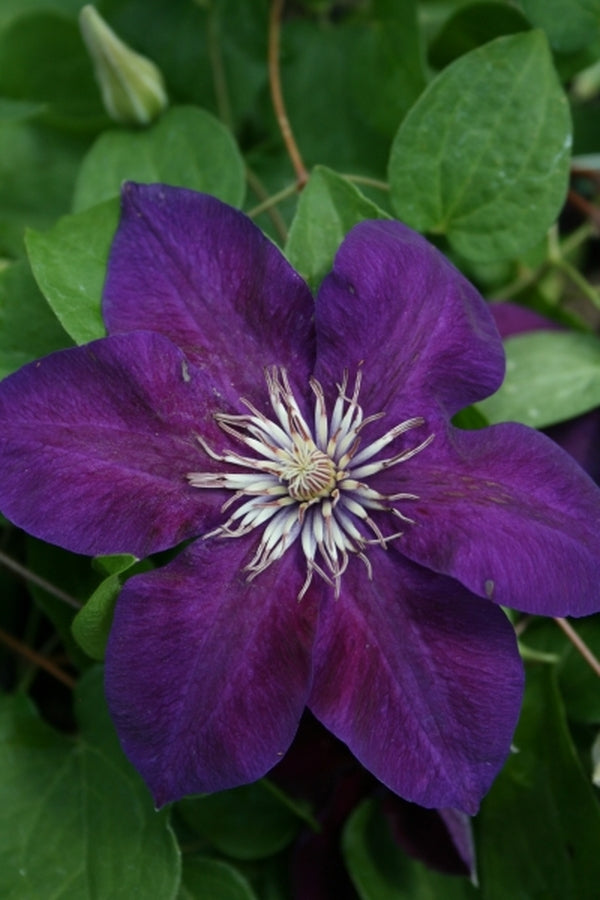 (aka: C. 'Kivireim') This 1987 introduction comes from breeder Uno Kivistik of Estonia and is named in honor of Rudolph Reiman, another Estonian clematis breeder. The 5' tall vine is adorned starting in early summer with 5" dark purple flowers, highlighted by a red-violet flush...most visible with cooler nights.