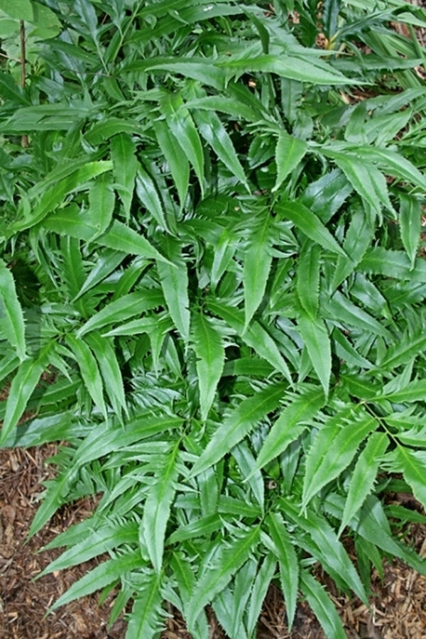 Japanese nurserymen are known for finding (and creating) odd mutant plants and there is no better example than Coniogramme intermedia 'Yoroi Musha'. The 3' tall x 2' wide fronds emerge from a slowly creeping rhizome (4' wide in 5 years in NC). Each glossy, dark green frond has pinnae that randomly mutate and form odd protrusions, ensuring that no two fronds are exactly alike. We find that these easy-to-grow coniogrammes are equally at home in dry or moist soils.