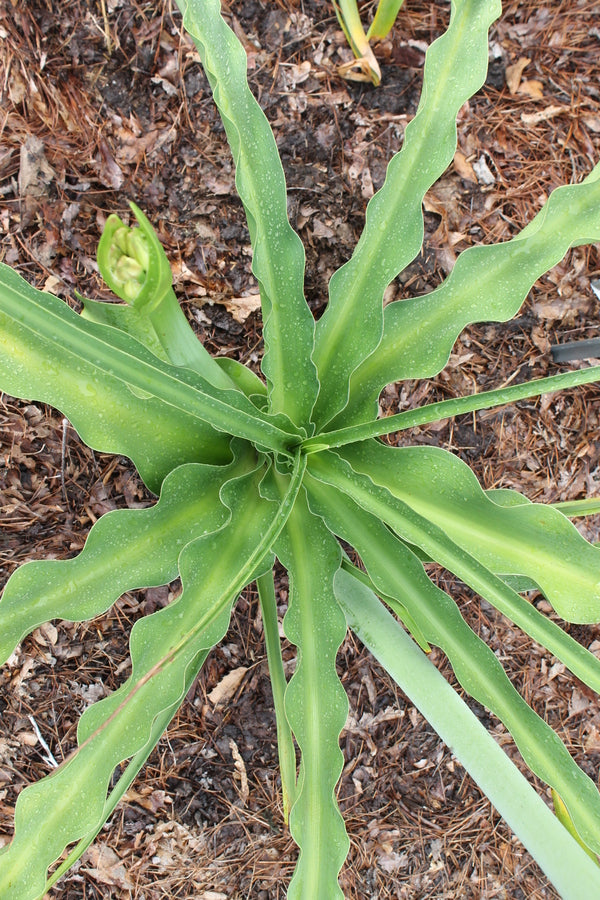 Crinum 'African Queen' was originally imported from Africa in 2000, without a name, by Florida plantsman, Nestor White. Crinum 'African Queen' forms a 1' tall compact, slowly-offsetting, octopus-shaped rosette of deeply ruffled glossy green foliage topped, starting for us in early September (NC) with sturdy 3' stalks of 14-16 red-striped buds each, opening to pure white, pendant, tubular flowers. In warmer climates, flowering can start as early as late summer. Nestor thinks that it may be a fertile Crinum stulhmanii x Crinum macowanii hybrid.