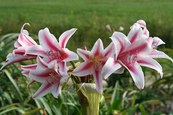Crinum 'Liberty Bells' is a superb introduction from the late Marcelle Sheppard introduction of a cross of Crinum bulbispermum 'Jumbo' x Crinum scabrum 'Rose City Schoolhouse'. The fountain of large, glossy green foliage is topped with 42" tall stalks of flowers which start for us in mid-May. The widely-flaring tubular flowers are white with a dramatic burgundy stripe down the center of each petal, and saturated burgundy red on the petal back. Like many human body parts, the flowers emerge horizontal before becoming pendent as they age. Crinum 'Liberty Bells' multiplies and flowers very well.