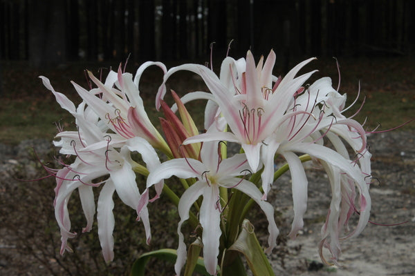 Can you say Holy Mosess? This truly incredible Dave Lehmiller crinum lily hybrid (Crinum mauritianum x Crinum fimbriatulum) produces a fountain of huge upright, arching green leaves that are topped for us, starting in mid-August and continuing into mid-September, with wrist-sized 5' stalks...no exaggeration. Each tree-like green flower stalk is topped with white and burgundy striped buds that open to reveal 23 huge 9" wide, spidery-white flowers, each with a pink blush toward down the center of each petal as well as at the petal tips. You've never seen a crinum lily like this!