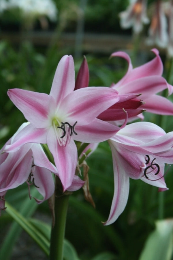 Crinum 'Parfait' is a 1980 Thad Howard hybrid, derived from a cross of Crinum scabrum x Crinum x powellii 'Krelagei'. The sturdy 30" scapes are topped in summer with an abundance of carmine red flower buds, opening to large, fragrant, open-faced deep pink flowers with a subtle red stripe down the middle of each petal. To quote Thad from his book, "Bulbs for Warm Climates", "It should be in every crinum collection." Who are we to disagree?