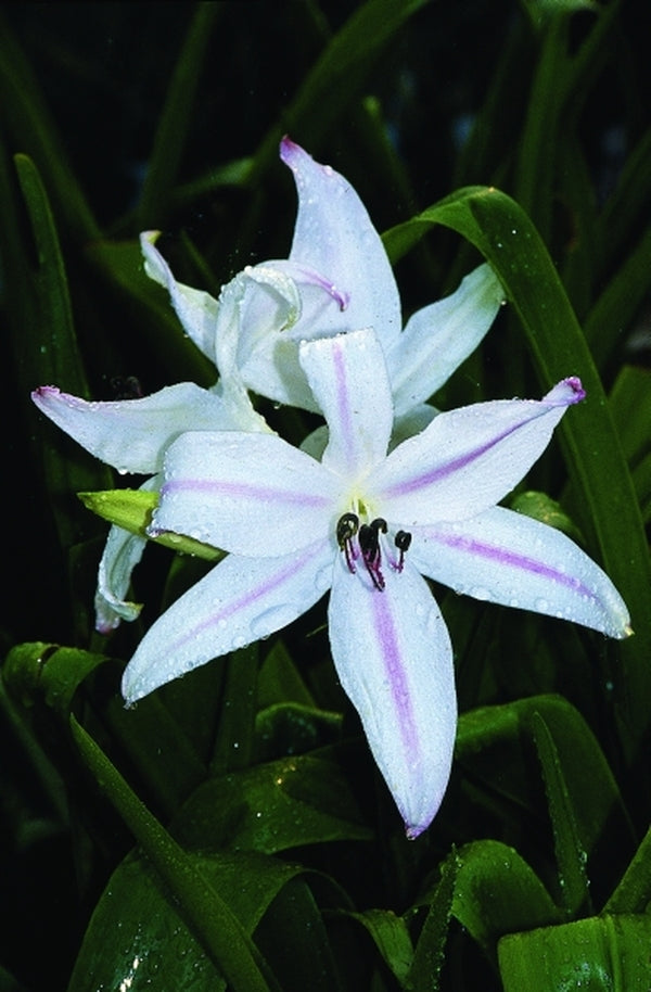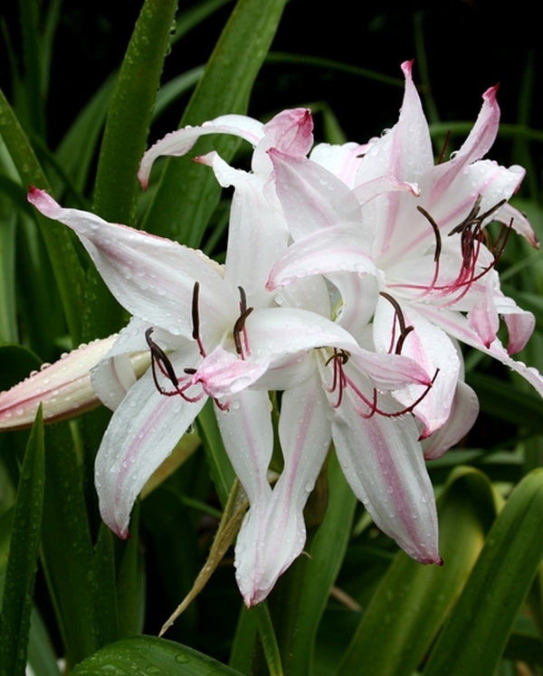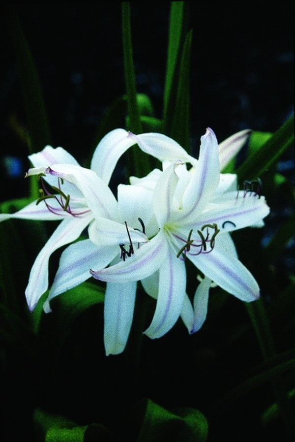 (syn: Crinum 'Nassau') This vigorous, fast-multiplying hybrid crinum lily has been grown in the US since at least 1873 (according to Scott Ogden). Crinum 'Royal White' is probably a hybrid of Crinum scabrum x Crinum americanum that makes a large mound of glossy green, sprawling foliage. From midsummer to fall, Crinum 'Royal White' clumps are topped with sturdy, 30" tall stalks of 6 large, open-faced white flowers with light maroon-wine stripes down each petal. The wonderful fragrance from Crinum americanum is passed along to this offspring. You'll have to pretend that we have scratch and sniff...just substitute your spouse and pretend he/she is a crinum. On second thought...