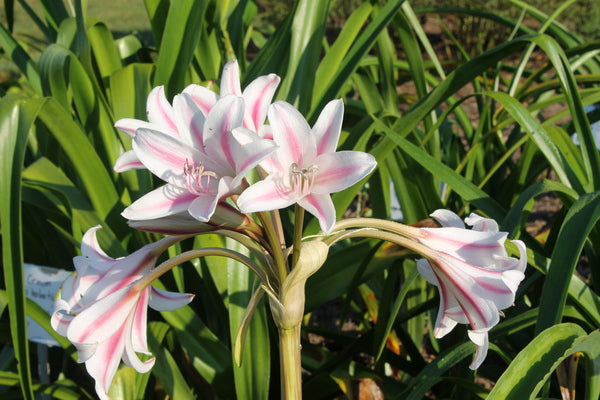 Crinum 'Temple Bells' is one of the best introductions from the late crinum breeder Marcelle Sheppard...a cross of Crinum macowanii x Crinum scabrum 'Rose City Schoolhouse'. Crinum 'Temple Bells' forms a large rosette of wide, glaucous green foliage, topped, starting in late June (NC) with 3' tall stalks, each ending in 15-18 sweetly-fragrant, tubular white flowers, heavily striped with burgundy on the flower keels.