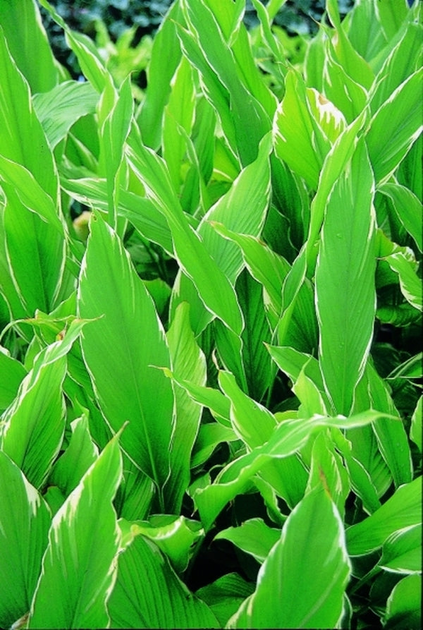 This Tim Chapman introduction from Thailand is among the most spectacular of the "hardy tropicals" we grow. C. 'Emperor' makes an easy-to-grow, 2' tall x 2' wide clump of pleated green leaves (18" long x 6" wide), each with a dramatic white border. In early summer, you will enjoy the pinecone-like flower of purple and green at the base, and the rest of the growing season, you will adore the tropical foliage. It has survived 0 degrees F in our garden with no protection, but in colder climates, it makes a great house plant. Remember that curcumas do not emerge from dormancy until June...they are not dead!